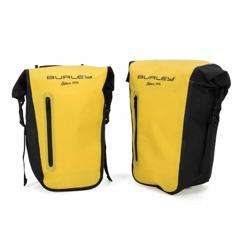 Les sacoches peuvent s’installer sur un porte bagages standard ou sur le porte bagages burley à installer sur la remorque.